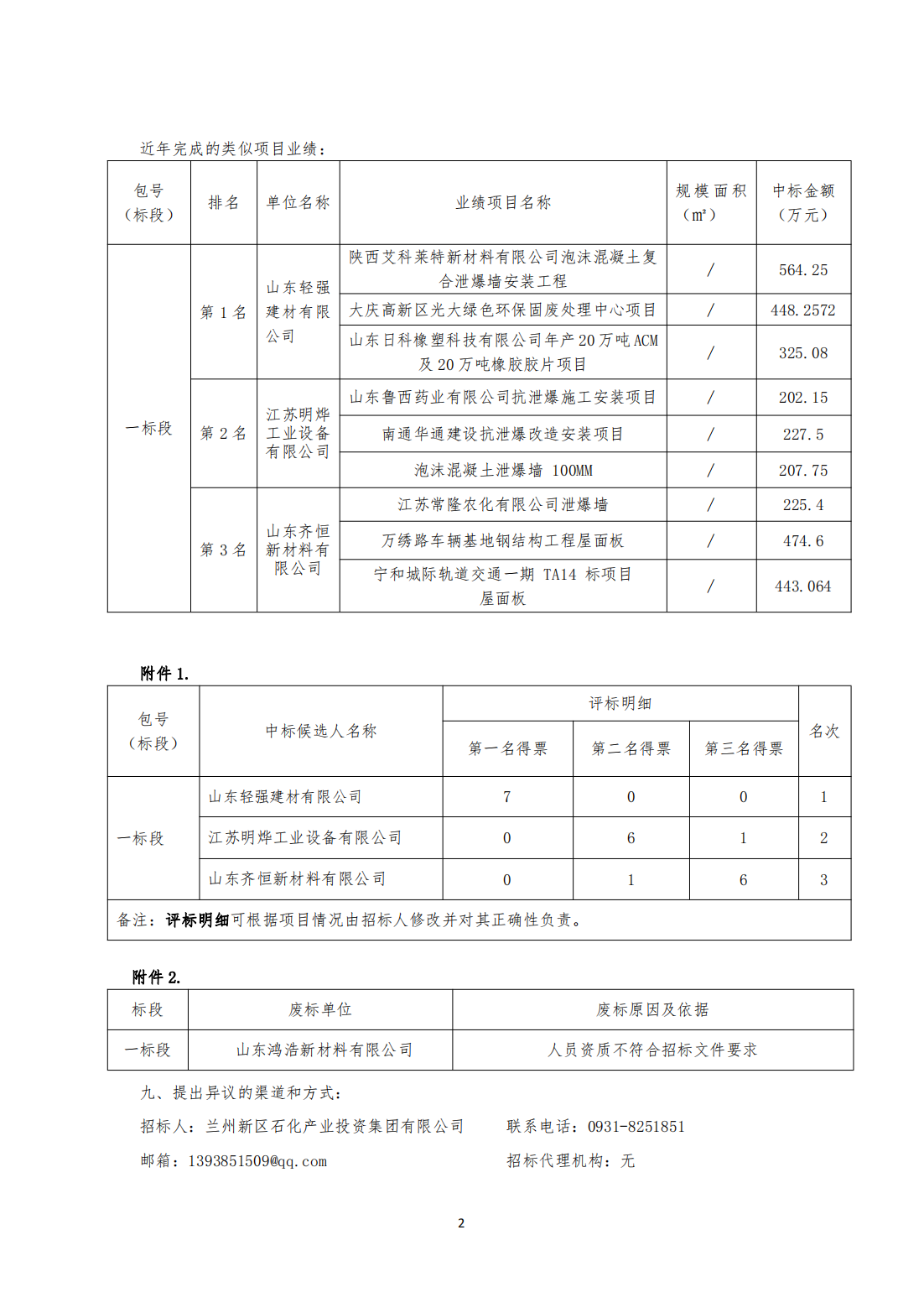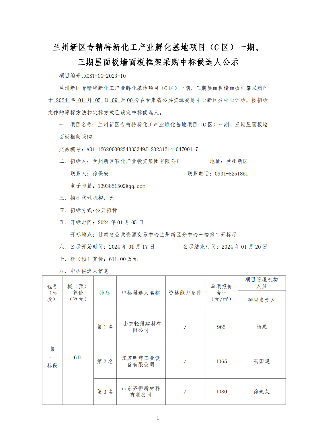 兰州新区专精特新化工工业孵化基地项目(C 区)一期、 三期屋面板墙面板框架采购中标候选人公示