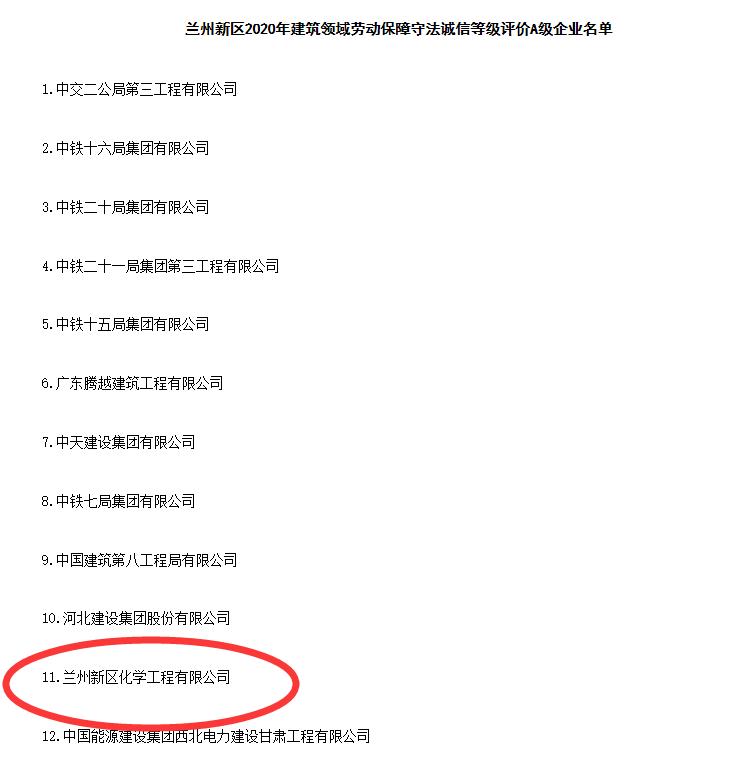 ¹¤³Ì¹«Ë¾£ºÏ²±¨£¡»¯Ñ§¹¤³Ì¹«Ë¾ÈÙ»ñÀ¼ÖÝÐÂÇø2020ÄêÐÞ½¨ÁìÓòÀͶ¯°ü¹Ü×ñ·¨³ÏÐÅÆ·¼¶ÆÀ¼ÛA¼¶ÆóÒµ