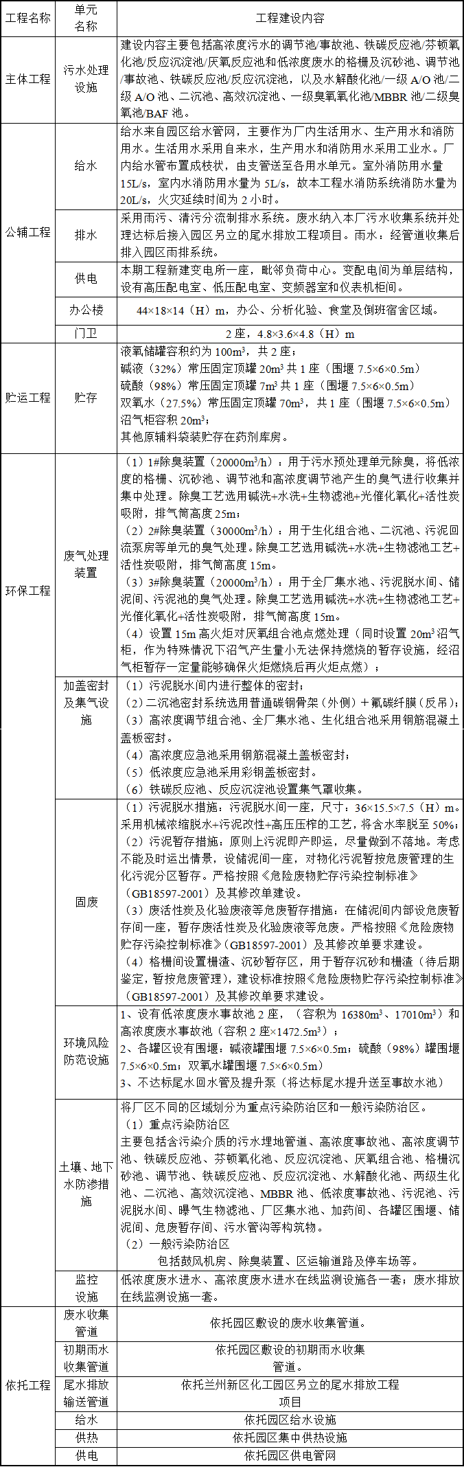 ±¾ÏîĿλÓÚÀ¼ÖÝÐÂÇø»¯¹¤Ô°¶«Çø×îÄ϶Ë£¬Î³Îåʮ·Äϲ࣬¾­ÈýÊ®Îåһ֧·Óë¾­ÈýÊ®Áù·֮¼ä¡£³§ÇøÖÐÐÄλÖõØÀí×ø±êΪ£º¶«¾­103.566948944¡ã£¬±±Î³36.613826038¡ã£¬Éè¼Æ´¦Öóͷ£¹æÄ£Îª1.25Íòm3/d£¬ÆäÖеÍŨ¶È·ÏË®´¦Öóͷ£Á¿Îª1.00Íòm3/d£»¸ßŨ¶È·ÏË®2500m3/d£¬Éè¼Æ³öˮˮÖÊÖ´ÐС¶³ÇÕòÎÛË®´¦Öóͷ£³§ÎÛȾÎïÅŷűê×¼¡·£¨GB18918-2002£©ÖÐÒ»¼¶A±ê×¼¡£ÏîÄ¿Ö÷Òª½¨ÉèÄÚÈݼû±í1¡£